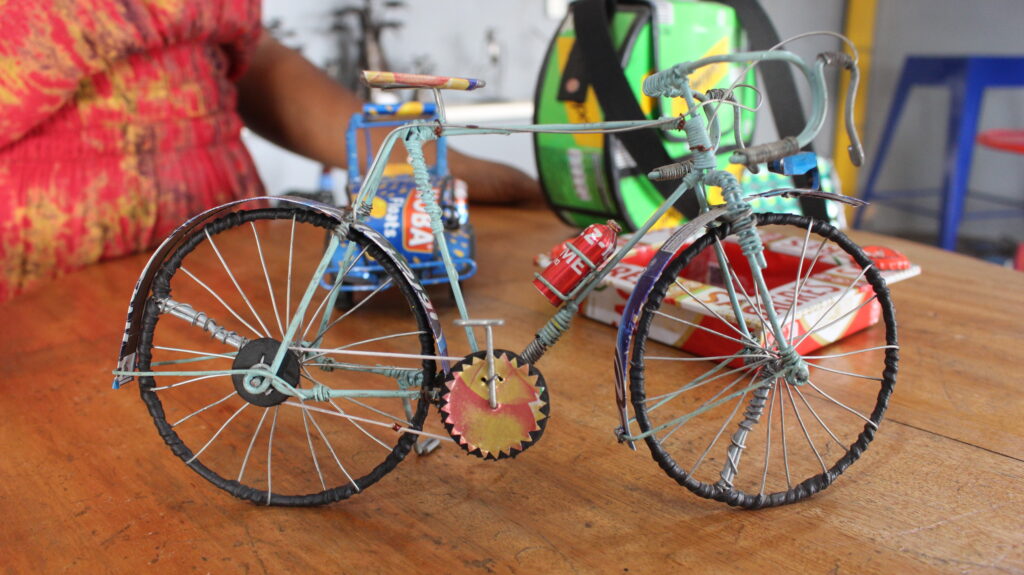 Mi colpiscono subito le piccole bici di fil di ferro e le macchinine di lattine, che riescono a rendere bella persino la Coca Cola, che di bello, buono e sostenibile non ha niente. L’aiutante del proprietario, nonostante non ami la fotocamera e le interviste, ci concede una bella chiacchierata, in cui ci racconta come funziona il lavoro nel laboratorio, come viene gestito il negozio e anche i tanti eventi esterni a cui partecipano con le loro esposizioni.