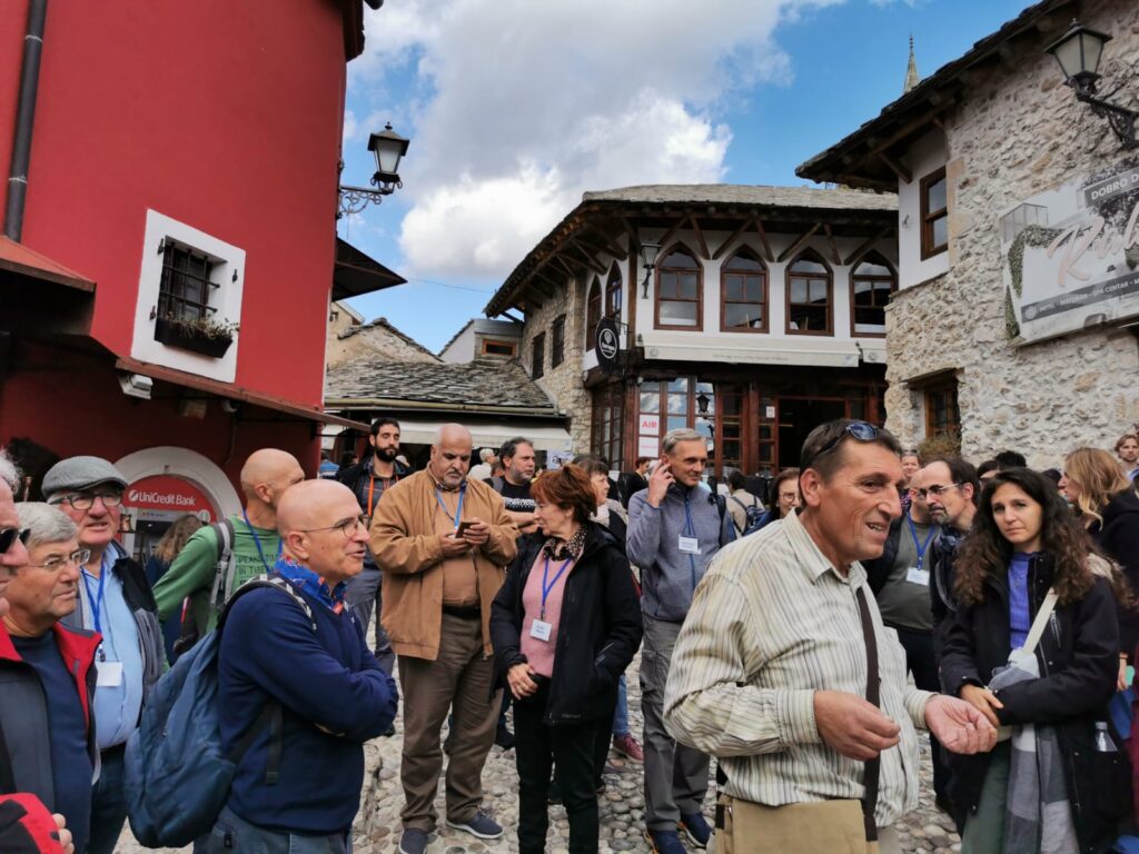 Girando per la città le immagini della guerra sono ancora tutte ben visibili, così come quelle di una pacificazione solo apparente. Molte case danneggiate o semidistrutte dai bombardamenti sono ancora in piedi come organi morti all’interno del tessuto urbano, con scritte che invitano a tenersi alla larga per il pericolo di crolli. Sul monte Hum, che sovrasta la città dalla parte cattolica, svetta una croce di 33 metri, più o meno issata nel punto in cui i croati tiravano granate per distruggere il ponte vecchio. Anche il campanile della chiesa di San Francesco, ricostruito nella parte croato-cattolica della città, è vistosamente sproporzionato rispetto alle dimensioni della base. Daniele ce lo dice con grande semplicità: il campanile doveva svettare per dare un evidente segnale politico sicché, durante la ricostruzione, fu sopraelevato.